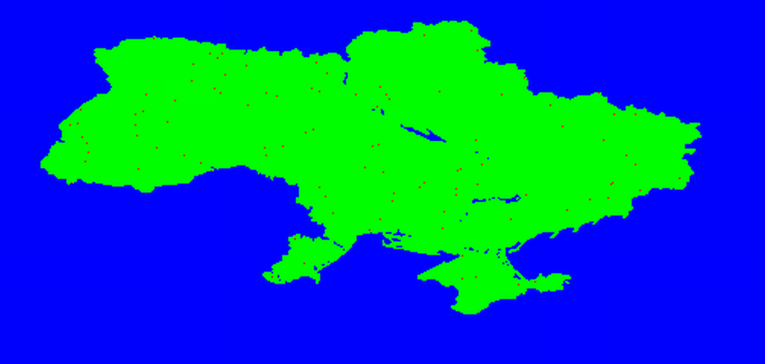 Click picture to zoom, country territory based on NASA Socioeconomic Data and Applications Center (SEDAC) data hosted by CIESIN at Columbia University. Red dots are selected locations, blue are water and terrytory outside of the country, green - country territory. Small image generated purely in Stata in BMP format, large - resized with an external tool, both compressed to PNG format.